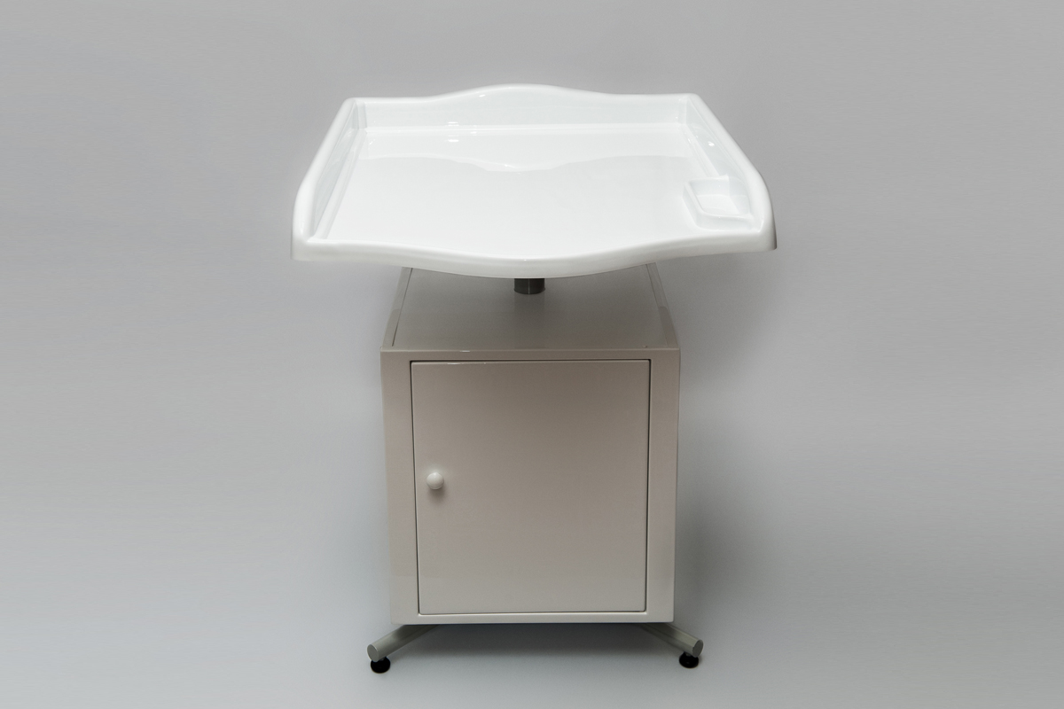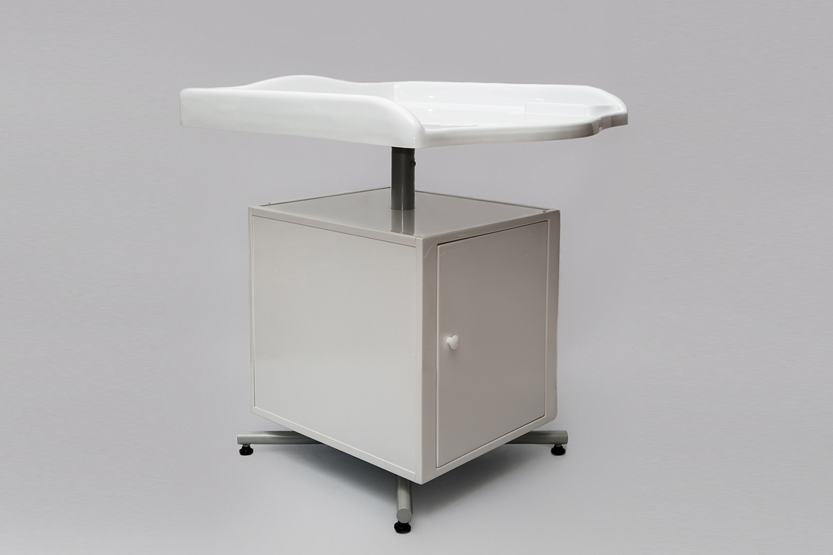 Пеленальный стол удобен и обеспечивает легкий доступ к новорожденному. В отличие от устаревших деревянных столов, столешница этого стола изготовлена из пластика белого цвета с акриловым покрытием, предназначенного для медицинских целей и для безопасности малыша дополнена бортиками. Имеется поворотная тумба с дверцами и двумя полочками для хранения различных принадлежностей, специальные ножки для установки по уровню. Легко дезинфицируется.