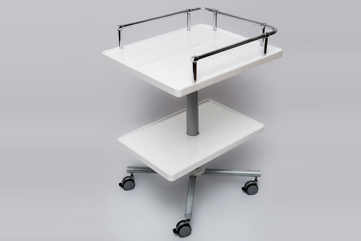 Металлический бортик столешницы и поворотные колесики с тормозом обеспечивают безопасность для малыша. Изготовлена из легкодезинфицируемого гипоаллергенного акрилового пластика, устойчивого к регулярной обработке всеми видами медицинских дезинфицирующих и моющих растворов. В качестве опоры используется одна центральная ножка и 4 самоориентирующихся опоры-колеса.